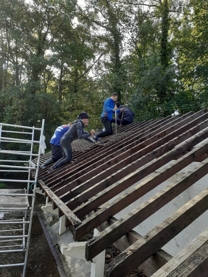 Toujours dans une bonne ambiance, la toiture prend forme.