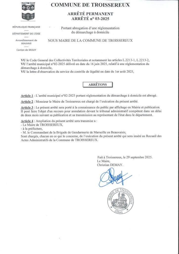 Arrêté n°03-2025 Permanent abrogation réglementation démarchage à domicile