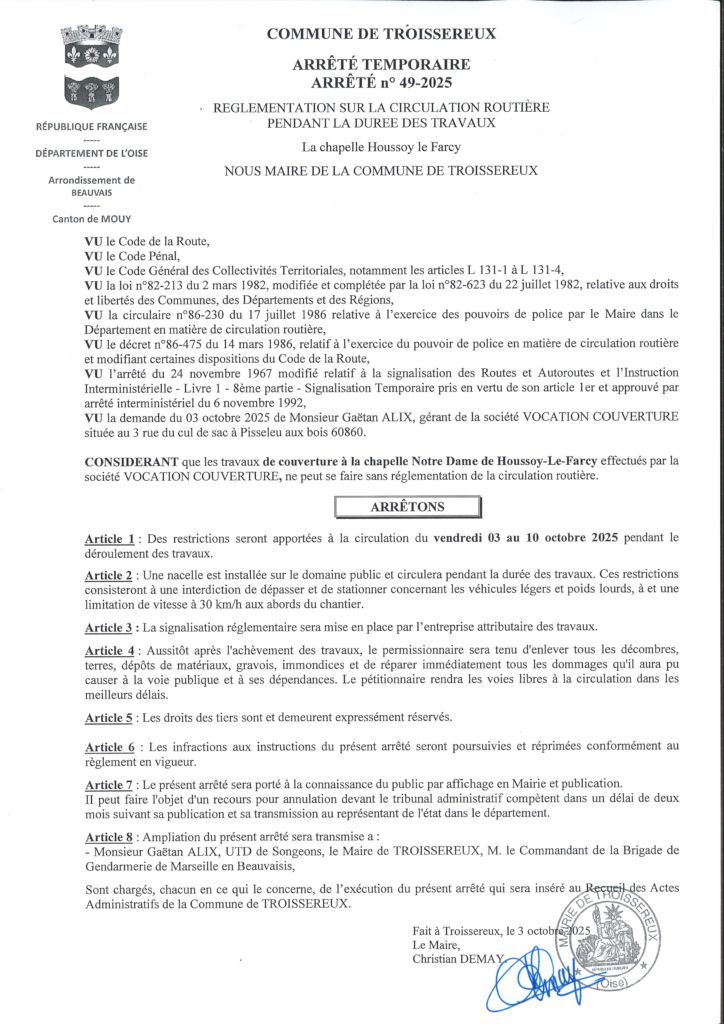 Arrêté 49-2025 Travaux chapelle Houssoy Le Farcy