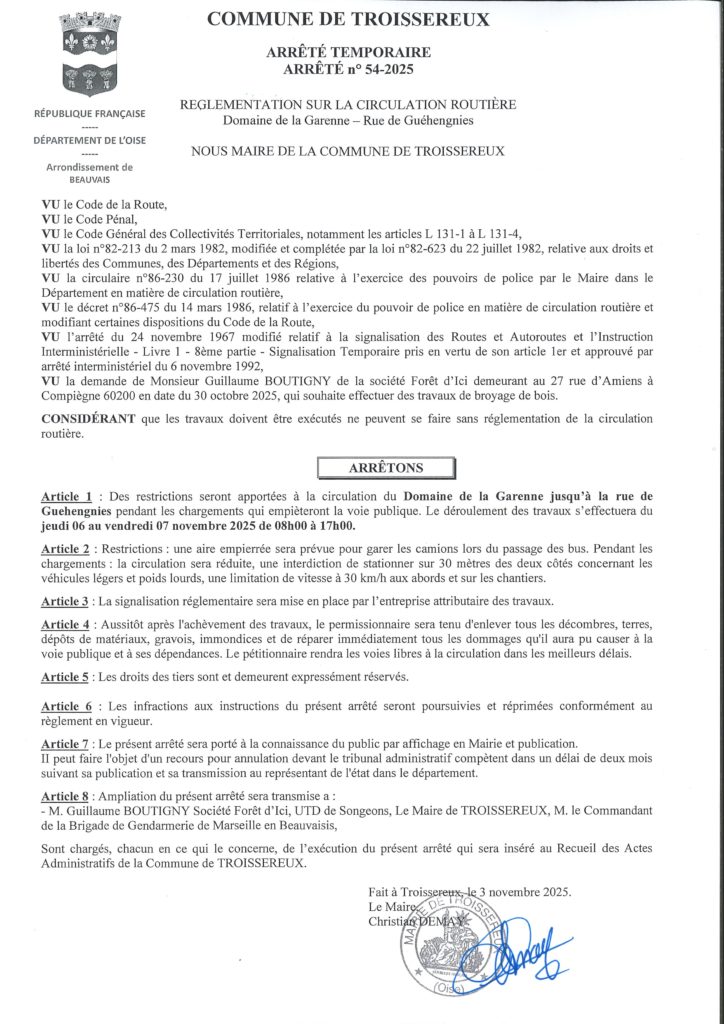Arrêté n°54-2025 Travaux Domaine de la Garenne