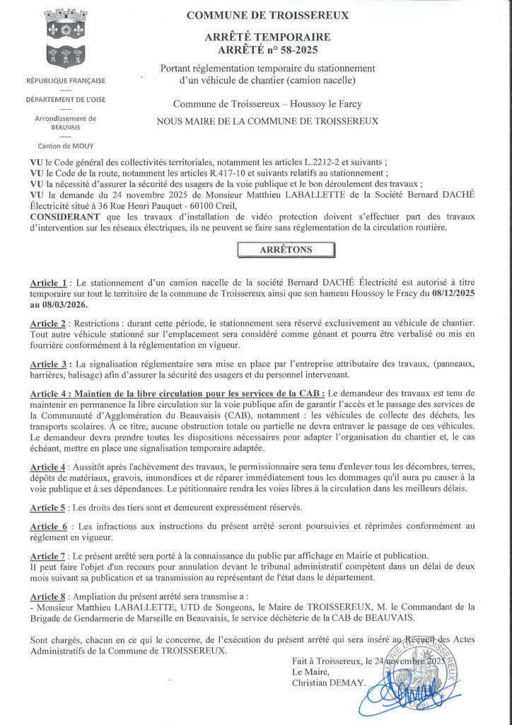 Arrêté 58-2025 Travaux Troissereux – Houssoy le Farcy